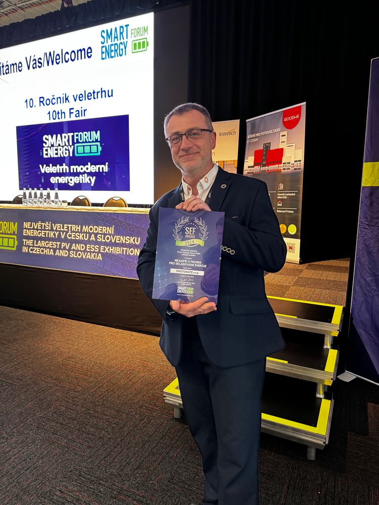 V rámci výstavy a konference Smart Energy Forum, která se konala v Praze ve dnech 9. a 10. října 2024, obdržela společnost PHOTOMATE s.r.o. ocenění SEF Awards 2024 v kategorii Nejlepší výrobek pro skladování energie.